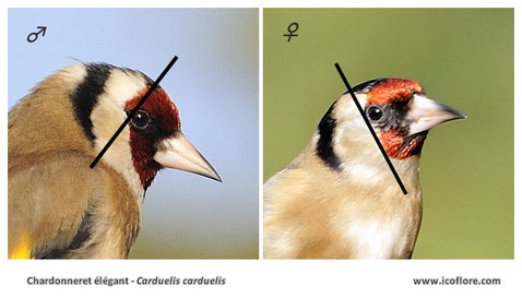 A contrario de la femelle (♀), le masque rouge chez le mâle (♂) est plus étendu et dépasse sur l'arrière de l'oeil. (cf. image ci-dessous)